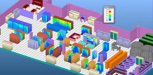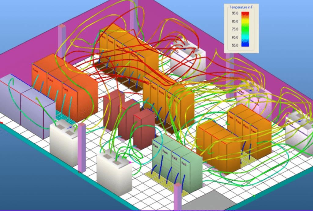 在TileFlow中,可以建立資料中心的模型,進而以此來模擬分析穿過通氣孔的冷卻空氣分布情形、機房內氣流流動的趨勢、機櫃設備上相對應的溫度分布、高架地板上與下的流場,這些資訊可供設計出資料中心機房內最佳的散熱設置。